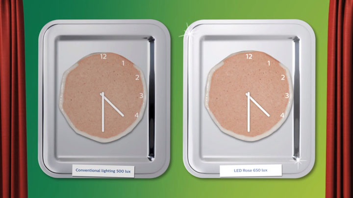 However, there are benefits to choosing the right spectrum of light. By using the proper spectrum, retailers can either delay discoloration for a longer shelf life or use higher light levels for more eye-catching displays. In the first case, shelf life can be extended by up to 20% at illuminance levels equivalent to conventional lighting. In the latter, retailers can apply light levels up to 30% higher to achieve a shelf life that is the same as with conventional lighting.