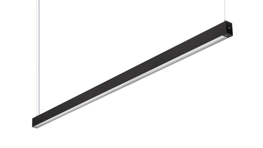 TrueLine Suspended, 2290x55 mm; H88 mm, Aluminum, Black, Signal black (RAL9004), Suspension set 2-wire, Sensor ready driver Interact System ready, Upgradable sensor slot with SNS210 sensor, 5000 lm, 36 W, 139 lm/W, 4000 K, (0.38, 0.38) SDCM <3, CRI>90, UGR19, Wide beam, Frosted, Polymethyl methacrylate, IP20 | Finger-protected, IK03 | 0.35 J reinforced, Safety class I, Push-in connector 3-pole, TP(b) diffuser flammability class, DC operated central emergency lighting