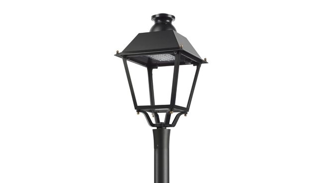 Urban road & street light, Aluminum, Black, Post-top for diameter 60 mm, Power supply unit (On/Off), 3250 lm, 38 W, 86 lm/W, 3000 K, (0.381, 0.379) SDCM <5, CRI80, Distribution medium 50, IP66 | Dust penetration-protected, jet-proof, IK09 | 10 J, Safety class II, Surge protection level until 6 kV differential mode and 8 kV common mode, Plug-in connector 2-pole Wieland/Adels compatible